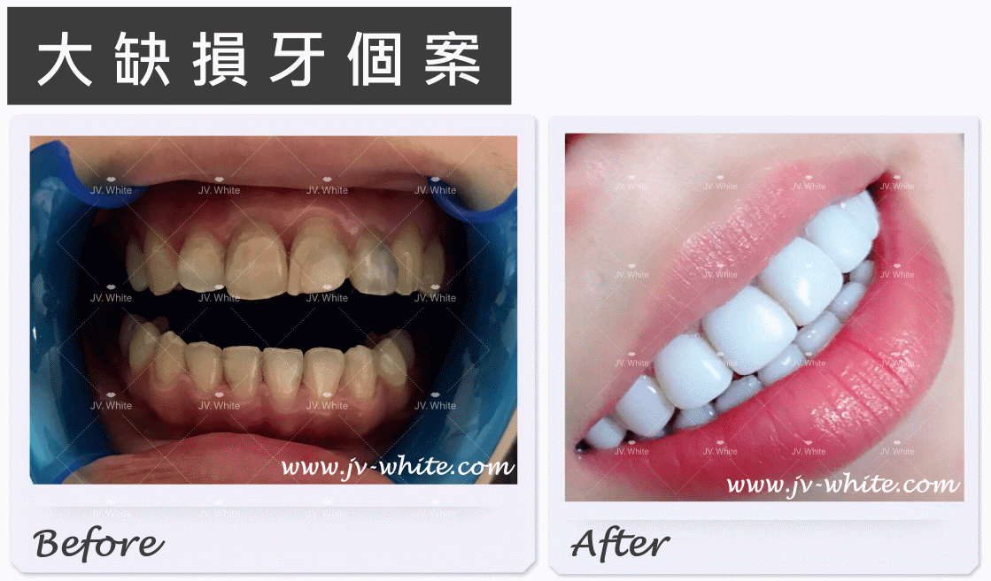門牙大面積缺損、顏色不均,美牙後潔白整齊,自信都回來了!